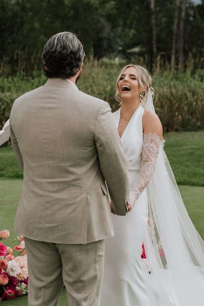 After the ceremony, guests enjoyed an outdoor cocktail hour and speeches on the patio of Fescues Restaurant, with laughter and toasts filling the air. Every detail reflected Taylor and Aidan’s personalities — fun, relaxed, and full of joy.