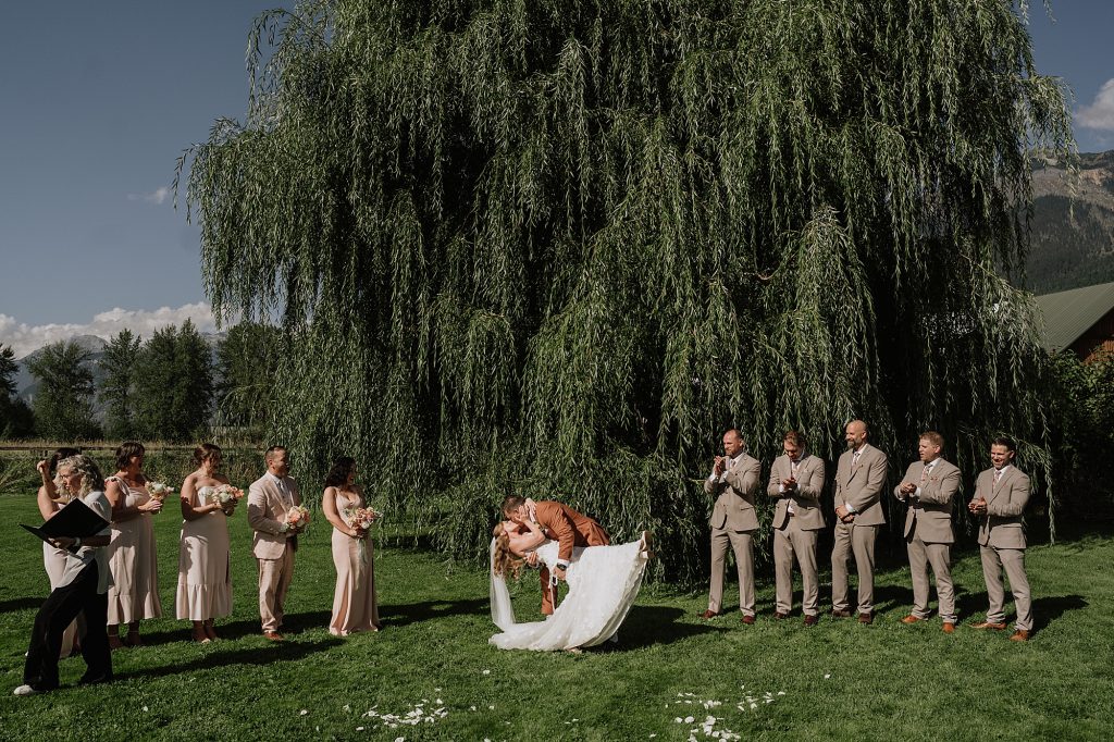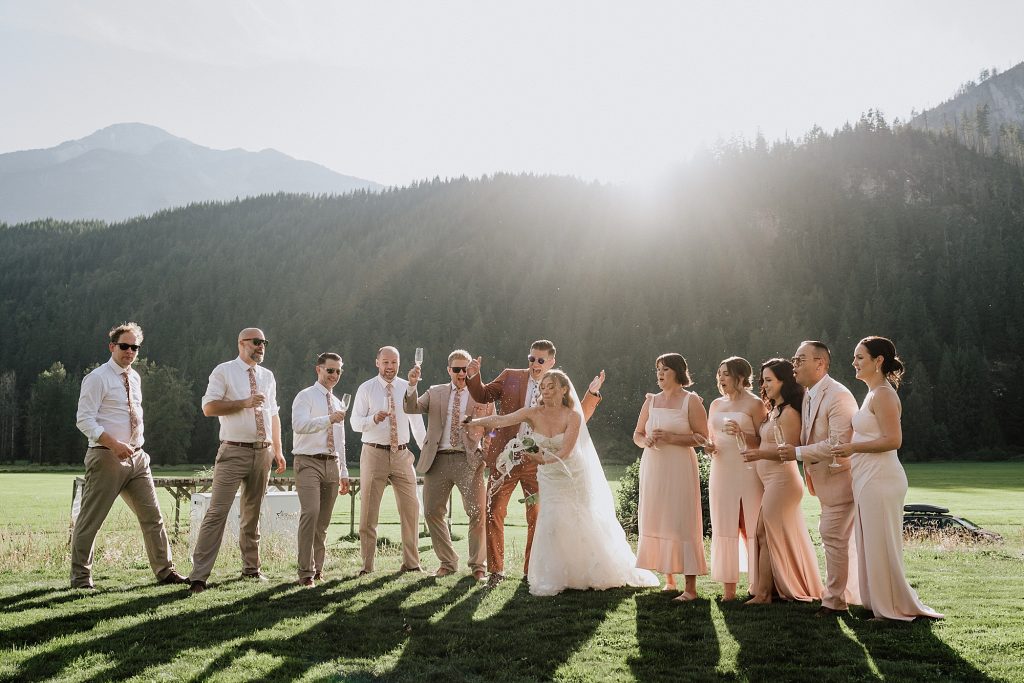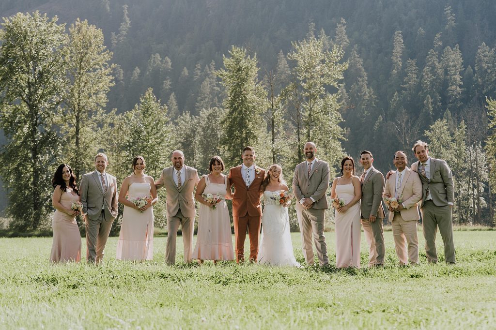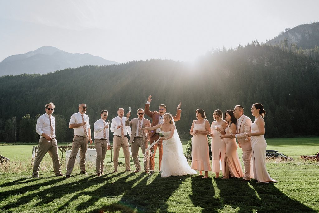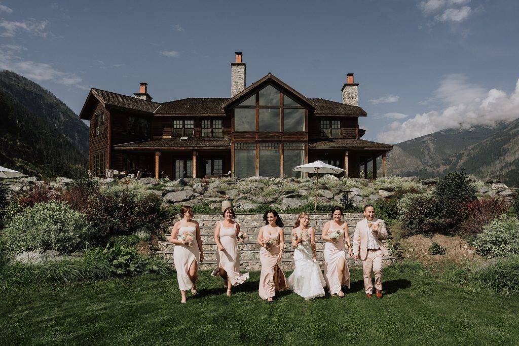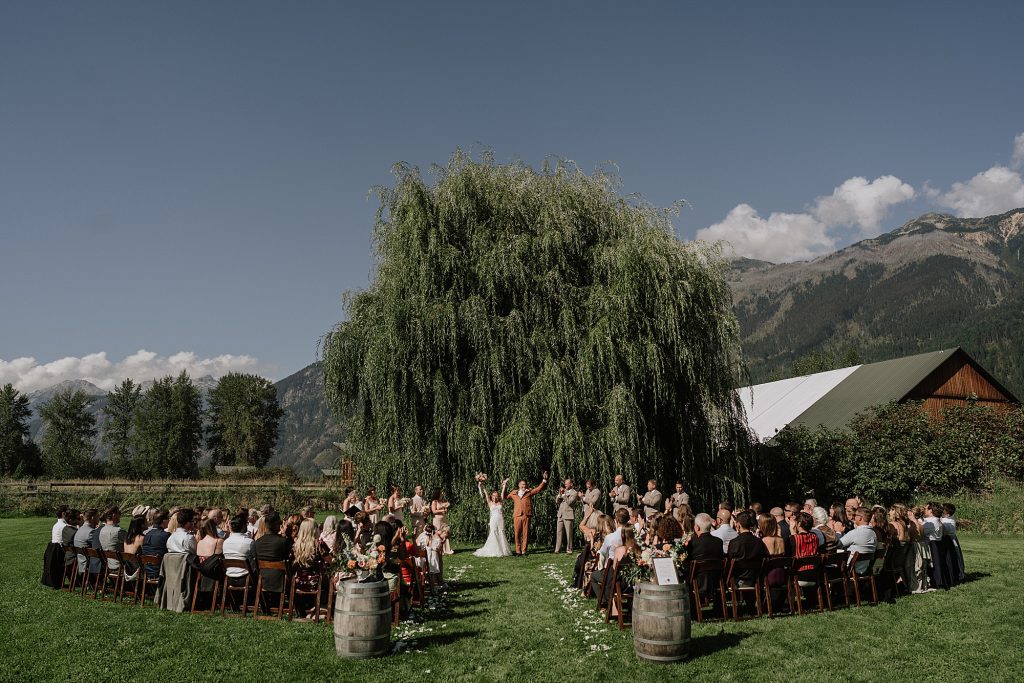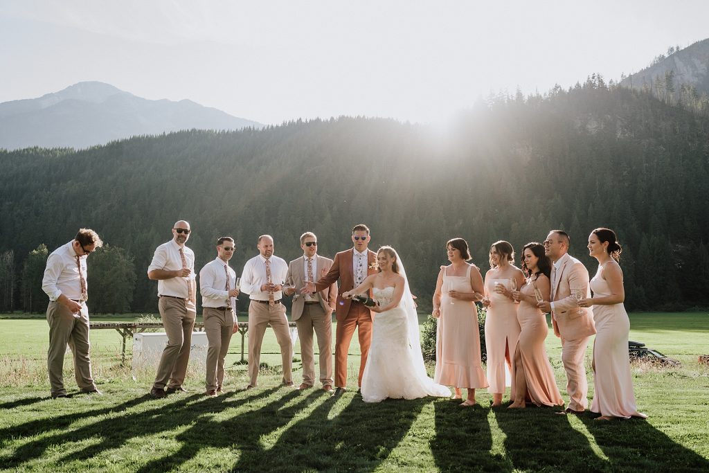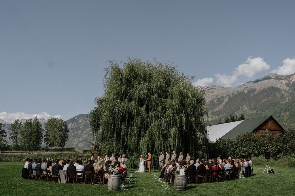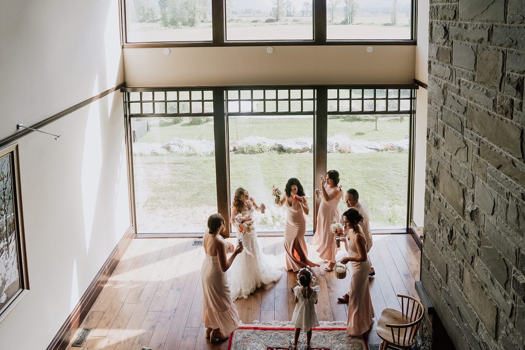 The wedding took place at a stunning executive home in Pemberton Meadows. Surrounded by forest, mountains, and open skies, the property offered the perfect balance of intimacy and space for celebration. A willow tree stood as a natural backdrop for the ceremony, while the house itself allowed the couple and their wedding parties to get ready in separate rooms but still mingle and hang out — a photographer’s dream.