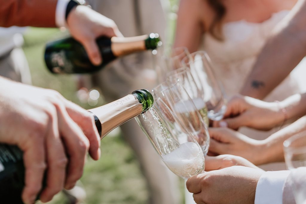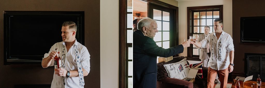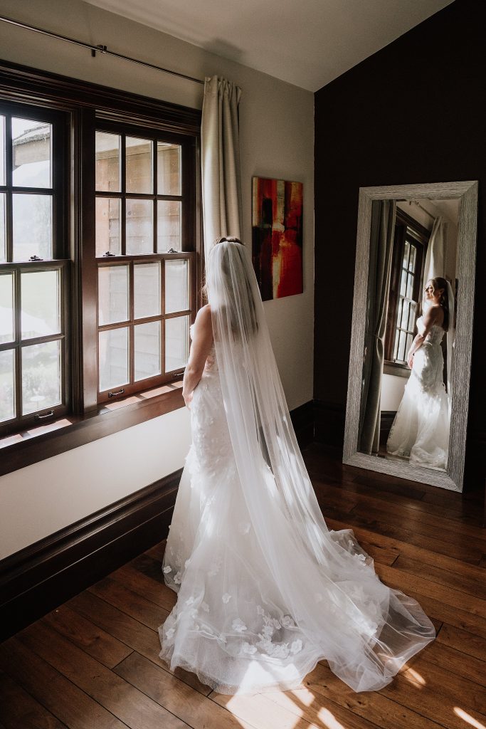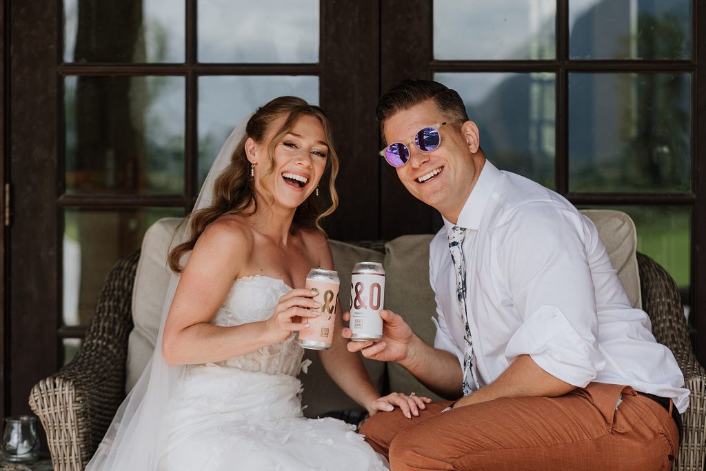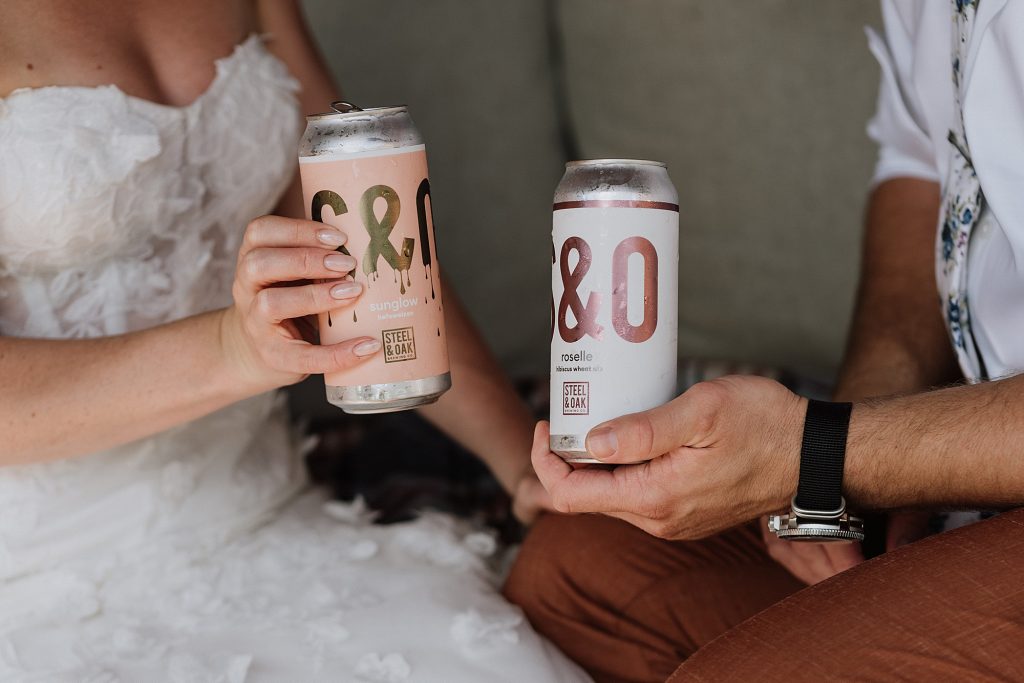 A rainy morning gave way to soft sun and clouds, perfect for portraits and capturing the gorgeous natural light of the day. Kaitlyn and Erik chose a private first look and a few portraits before the ceremony, giving them a quiet moment to soak it all in — including a special beer from the brewery where they had their first date, shared on a tucked-away deck couch.