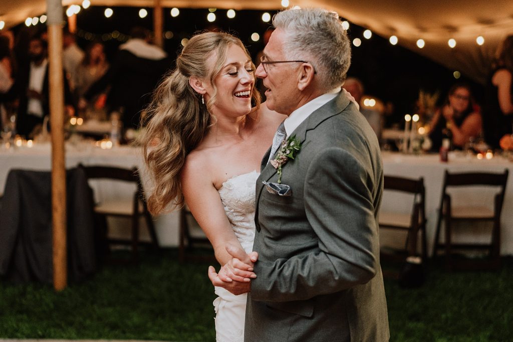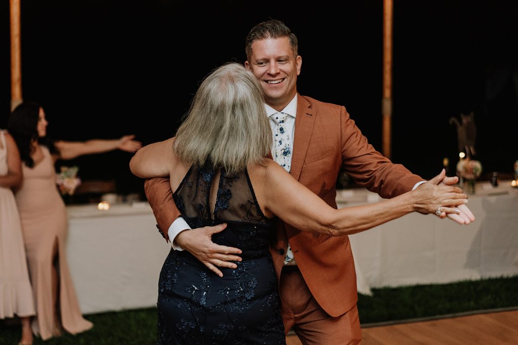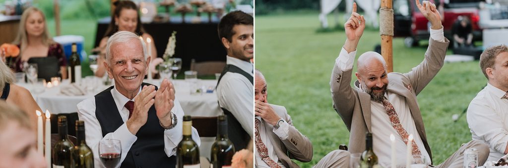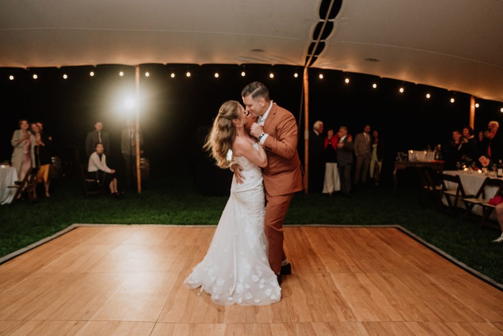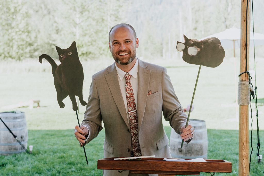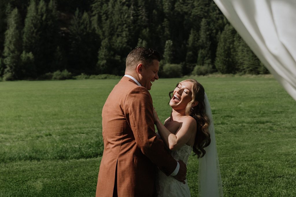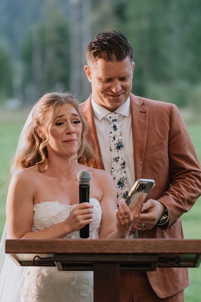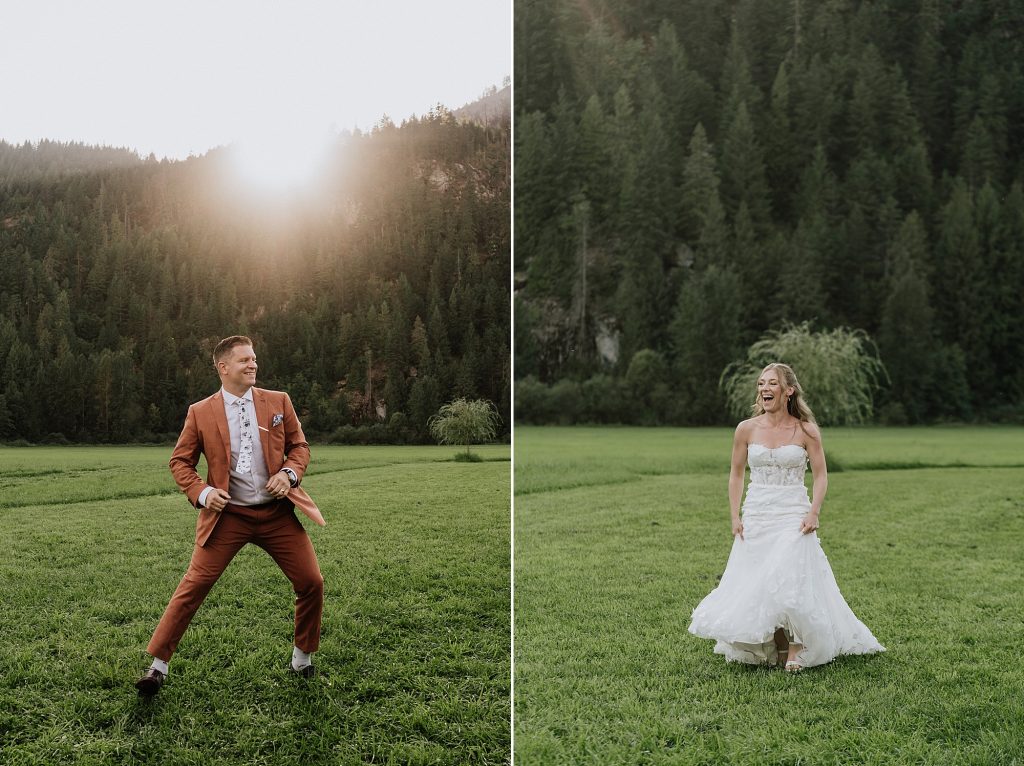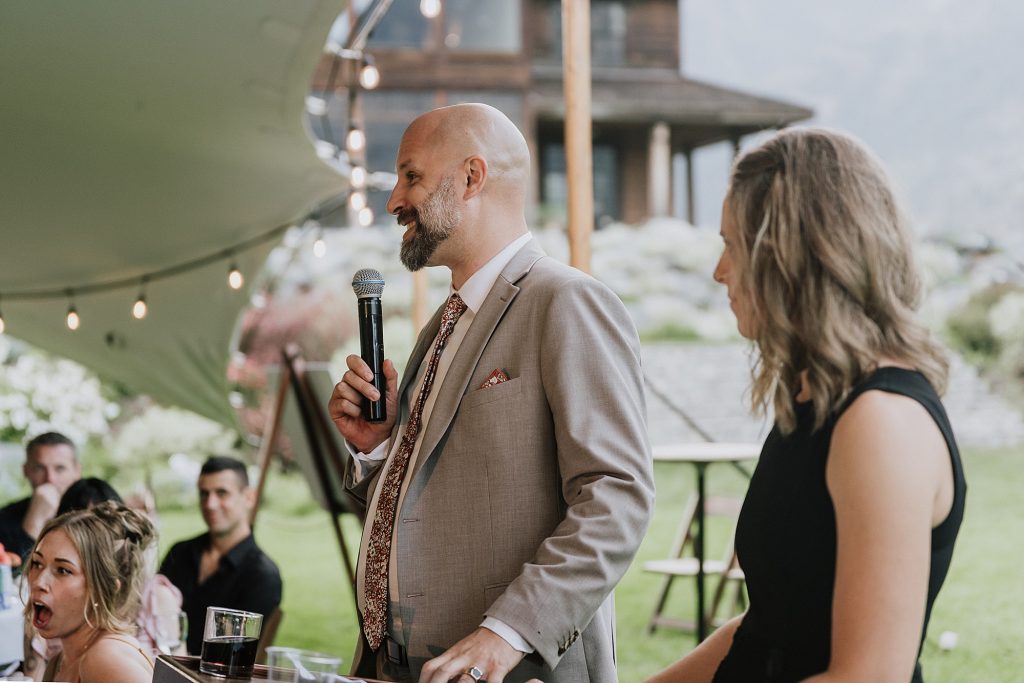 Dinner was served as a catered BBQ under a beautifully lit tent on the front lawn, framed by mountains and open skies. The sunset offered perfect, golden light for photos, while speeches turned seamlessly into dancing that lasted well into the evening. Every detail reflected the couple’s personalities — adventurous, thoughtful, and full of laughter.