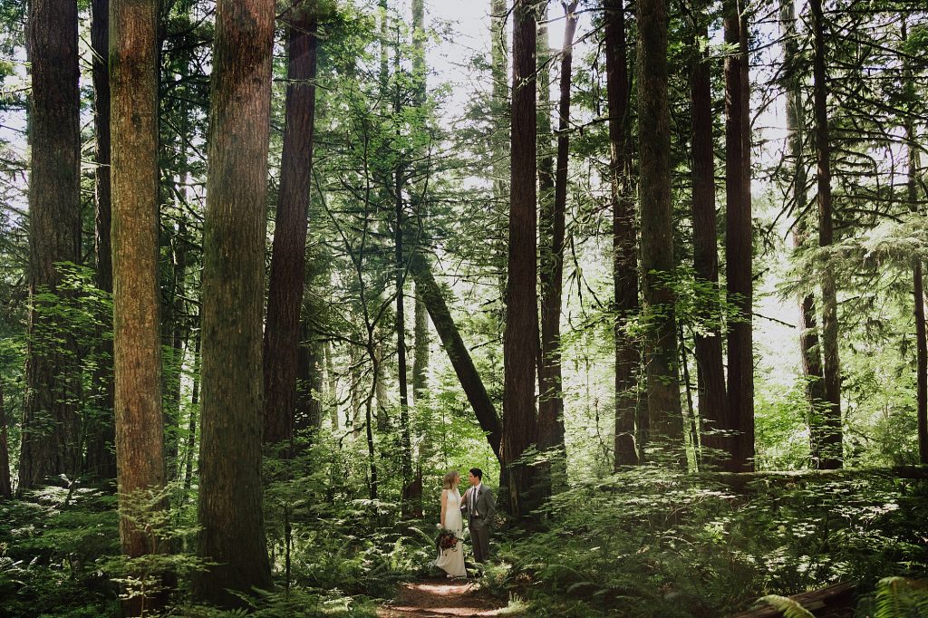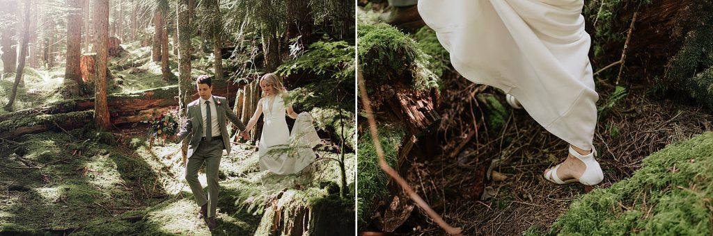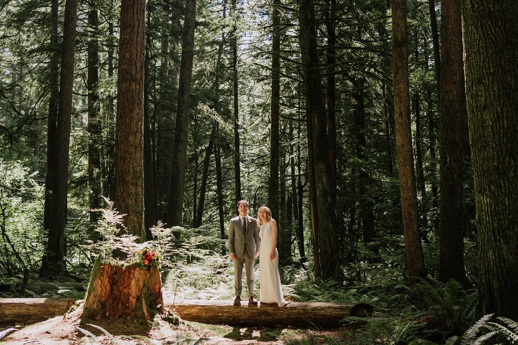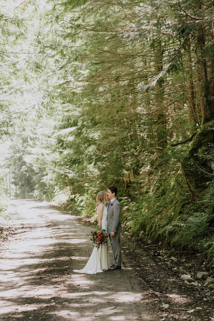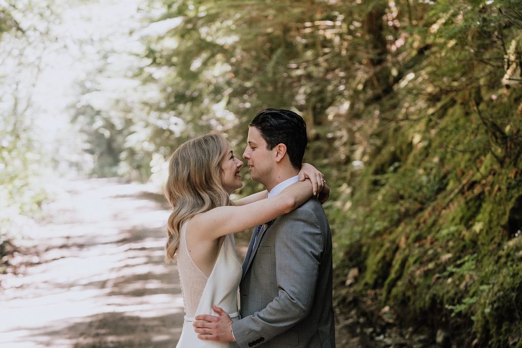 After the first look, we hopped in the car and drove up an FSR, stopping first in a mossy forest where soft sunlight filtered through the trees. These are the kinds of places that make portraits feel effortless — space to move, breathe, and simply be together.